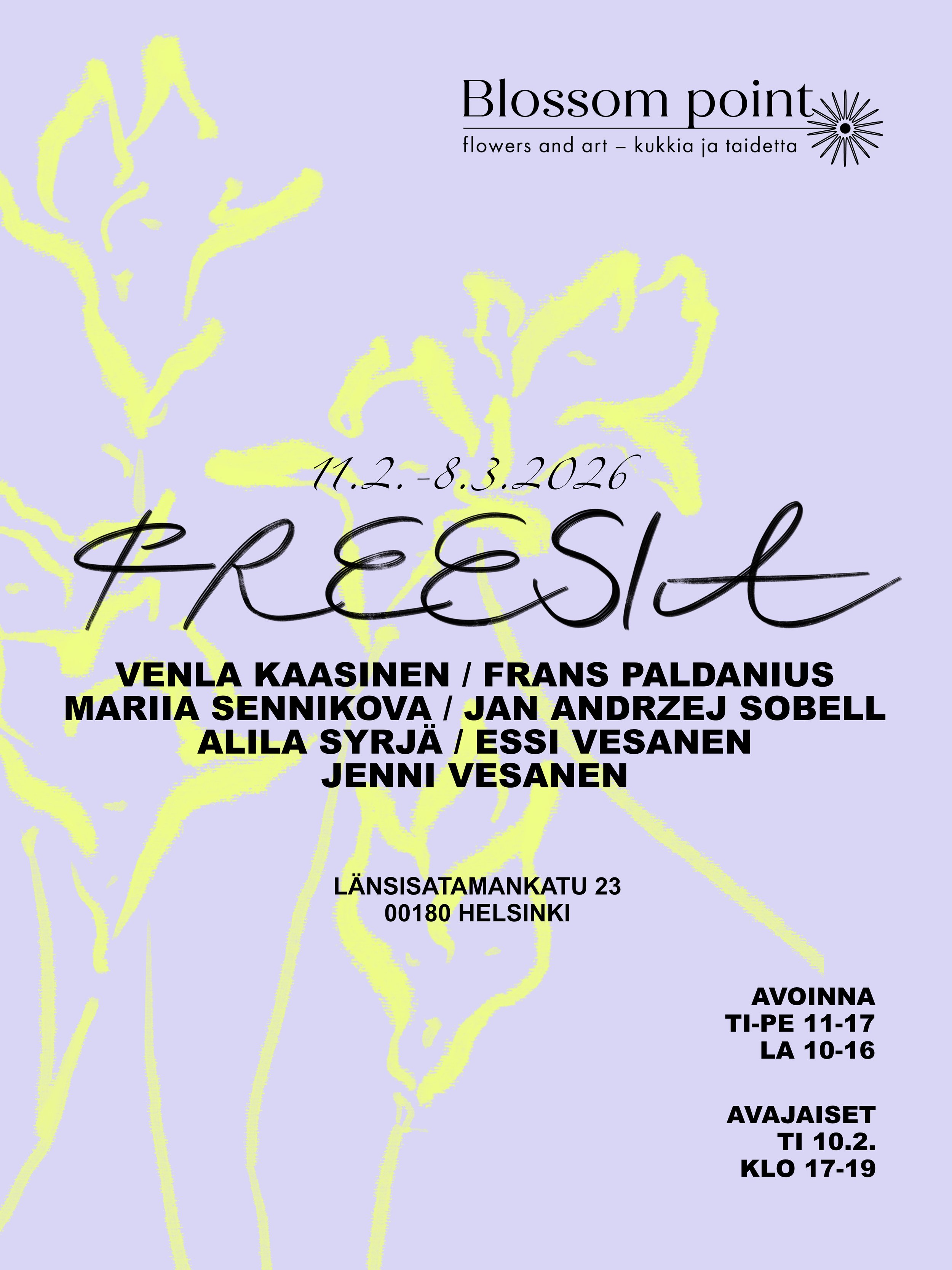 Ryhmänäyttely FREESIA koostuu Blossom pointin floristin ja galleristin Mariia Sennikovan taiteilijaystävien teoksista. Näyttelyn taiteilijat ovat Venla Kaasinen, Frans Paldanius, Mariia Sennikova, Jan Andrzej Sobell, Alila Syrjä, Essi Vesanen ja Jenni Vesanen