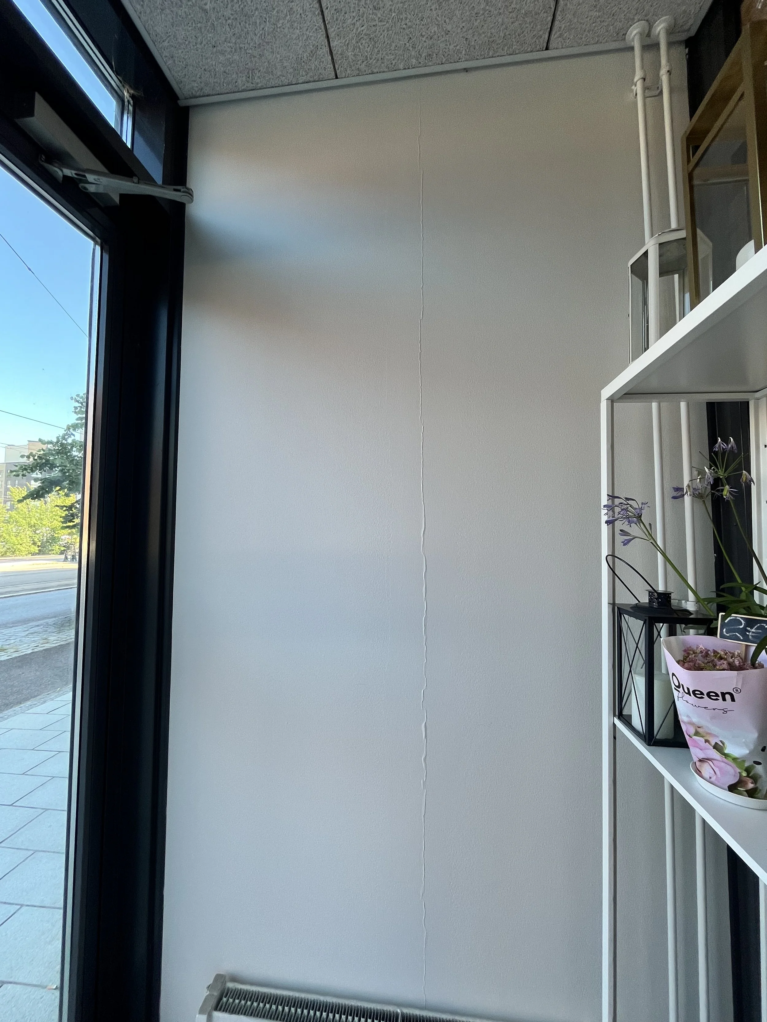 The gallery shares a common space with a flower shop. The artist has a 315 cm long wall in use and a 110 cm long wall at the entrance. The works are partially visible from the windows.